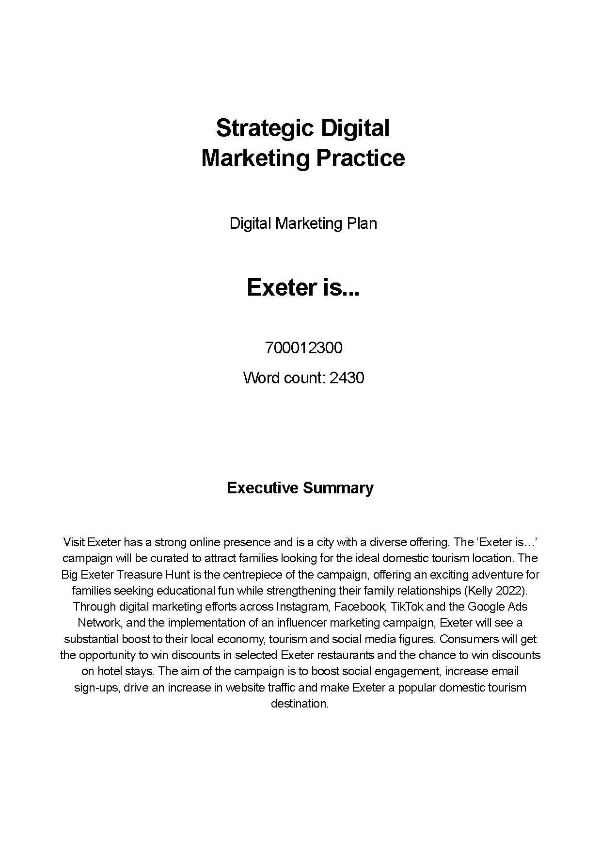 Part of my coursework for one of my university modules was to create a digital marketing plan for Visit Exeter. Below is my submission along with the entire university-style report submitted alongside the plan: